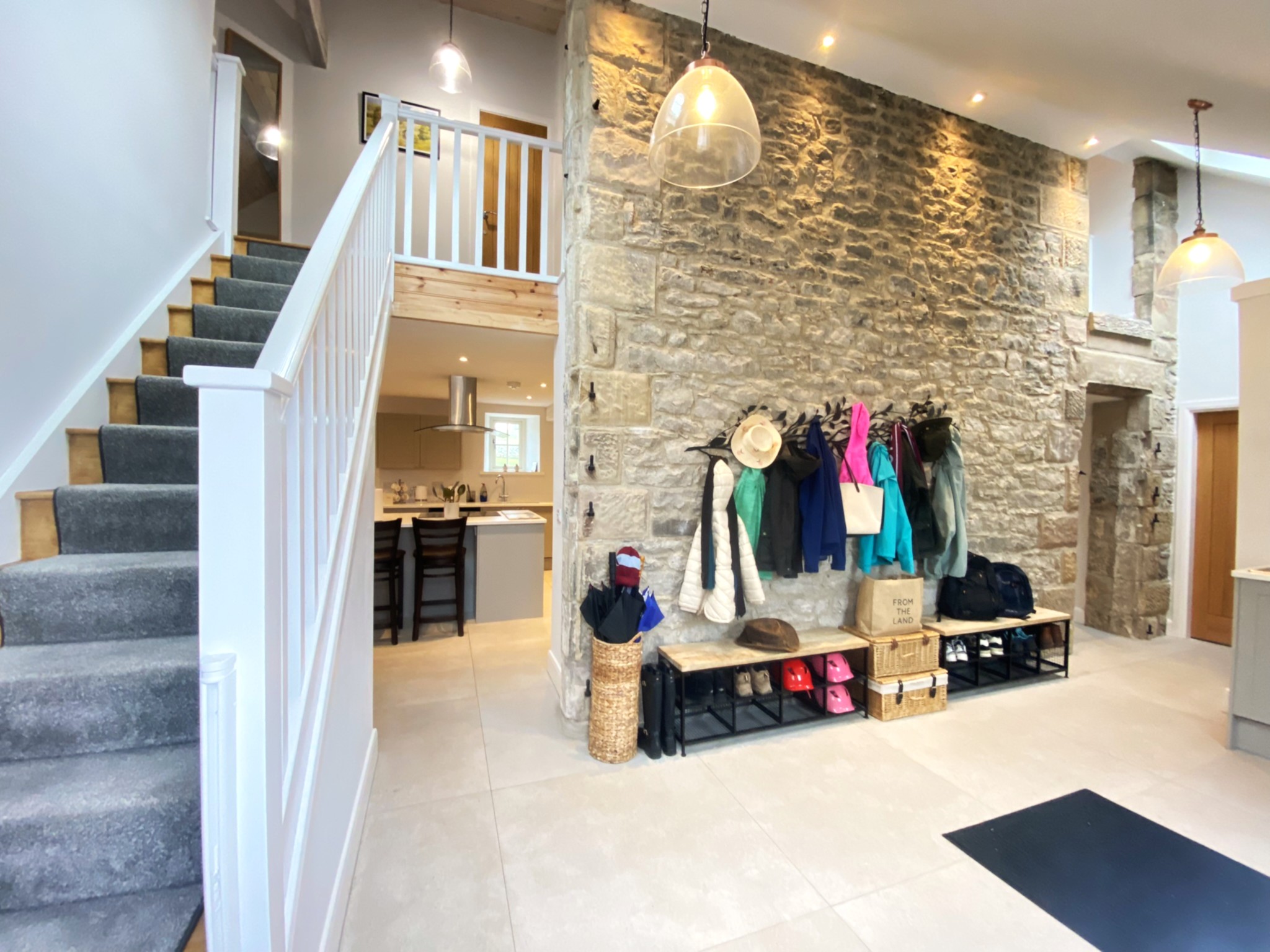 Entranced through the walled courtyard into the large hallway with provision for coats and boots etcetera with downstairs cloakroom and utility area with washing machine.